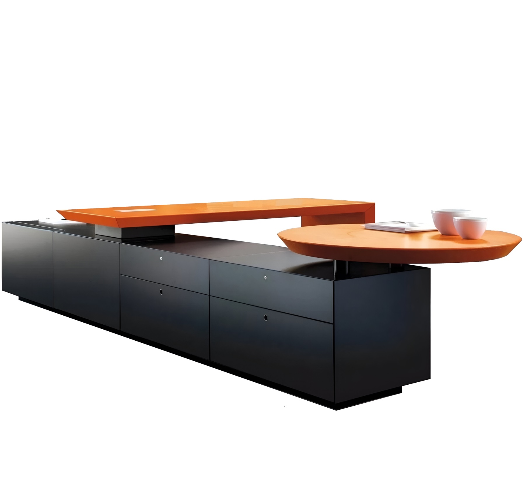 Incluye, escritorio principal; credenza (conector lateral) con seis cajones, dos puertas abatibles con entrepaño y dos espacios libres; mesa de junta en lateral.